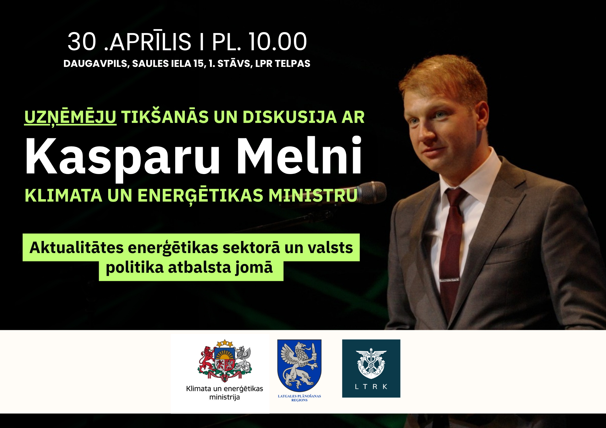 Jau 30. aprīlī Daugavpilī norisināsies tikšanās un diskusija ar klimata un enerģētikas ministru Kasparu Melni, uz kuru aicināti reģiona uzņēmēji. Pasākuma mērķis ir veicināt atklātu dialogu starp uzņēmējiem un valsts pārvaldi, pārrunājot nozarē aktuālos jautājumus un kopīgi meklējot risinājumus ilgtspējīgai attīstībai.