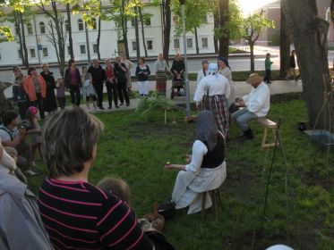 Viens no stāstiem šai vakarā bija arī par latgaliešu tradīcijām, ko parādīja etnogrāfiskais ansamblis „Rikava” uzvedumā „Pyrmuo gonu dīna” un izstāstīja, kādi darbi jāveic, kad pavasarī pirmo reizi govis izdzen ganos, piemēram, obligāti vajag rumulēties, jo tad vasarā būs tik daudz piena, cik ūdens izlijis, bet gani un saimnieki ilgi negulēs un čakli strādās. Labi, ka vakars bija silts, jo laistīšanās ar ūdeni muzeja pagalmā bija jautra un skaļiem izsaucieniem piepildīta – gluži slapjš nebija neviens, bet ūdens svētību gan saņēma daudzi, es tai skaitā un tagad zinu, ka šovasar būšu modra un darbīga.