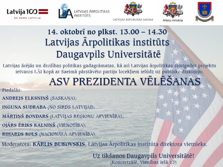Latvijas Ārpolitikas institūts (LĀI) piektdien, 14. oktobrī, no plkst. 13.00 līdz 14.30 rīko 58. ASV prezidenta vēlēšanām veltītu diskusiju, kurā Saeimā pārstāvēto partiju deputāti tiksies ar sabiedrību un diskutēs par vēlēšanu nozīmi Latvijai. Diskusija notiks Daugavpils Universitātē (Koncertzālē, Vienības iela 13, Daugavpilī).