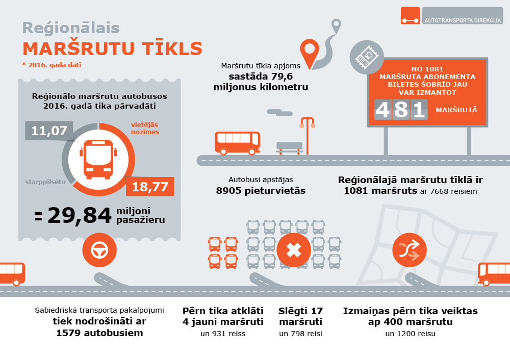 Pērn vairāk nekā 1500 reģionālo maršrutu autobusos tika pārvadāti 29,84 miljoni pasažieru. Neskatoties uz to, ka pasažieru skaits ir krities par 6%, kopējais autobusu maršrutu tīkls un izpildīto reisu skaits ir palielinājies. Autotransporta direkcija turpina darbu pie pasažieru piesaistīšanas sabiedriskajam transportam, uzlabojot maršrutu tīklu un piedāvājot pasažieriem lojalitātes programmas. Tāpat tiks turpināts darbs, lai turpmākajos konkursos par sabiedriskā transporta pakalpojumu nodrošināšanu tiktu paaugstinātas komforta un drošības prasības.