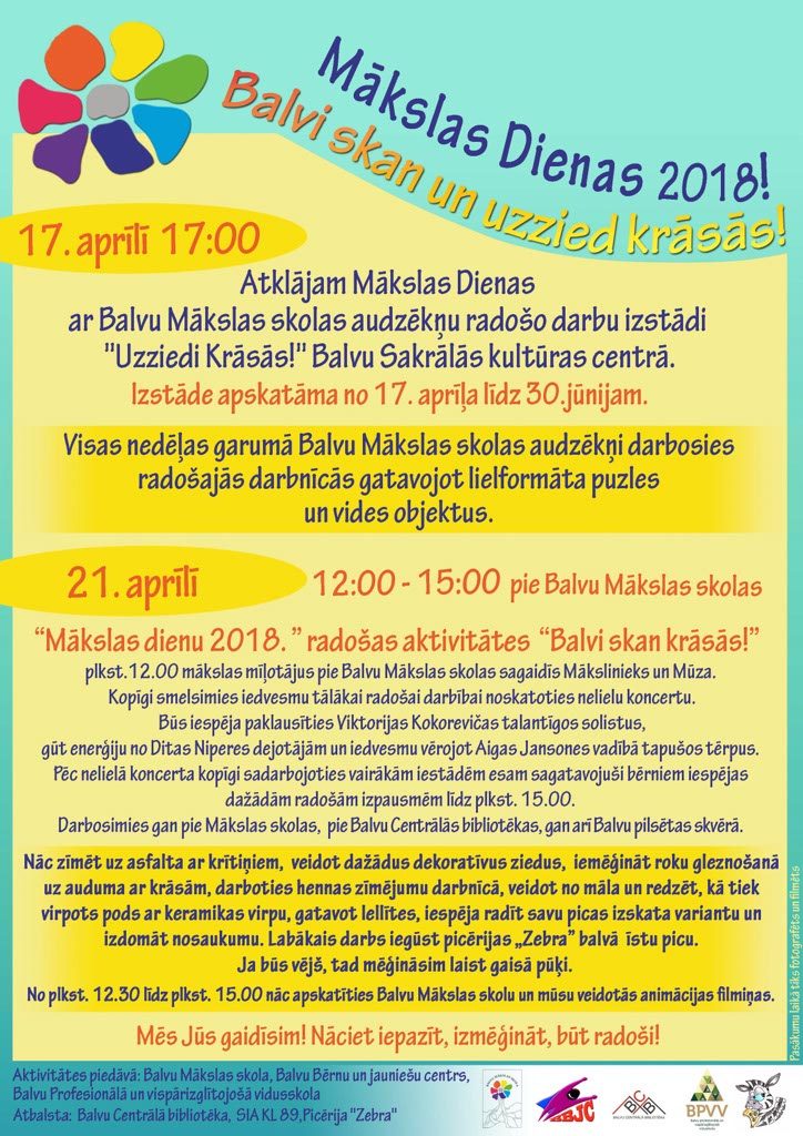 17.aprīlī plkst.17:00 “Mākslas Dienas 2018” atklāšana ar Balvu Mākslas skolas audzēkņu radošo darbu izstādi “Uzziedi Krāsās!” Balvu Sakrālās kultūras centrā. Tā būs apskatāma no 17.aprīļa līdz 30.jūnijam, bet visas nedēļas garumā Balvu Mākslas skolas audzēkņi darbosies radošajās darbnīcās, gatavojot lielformāta puzles un vides objektus.