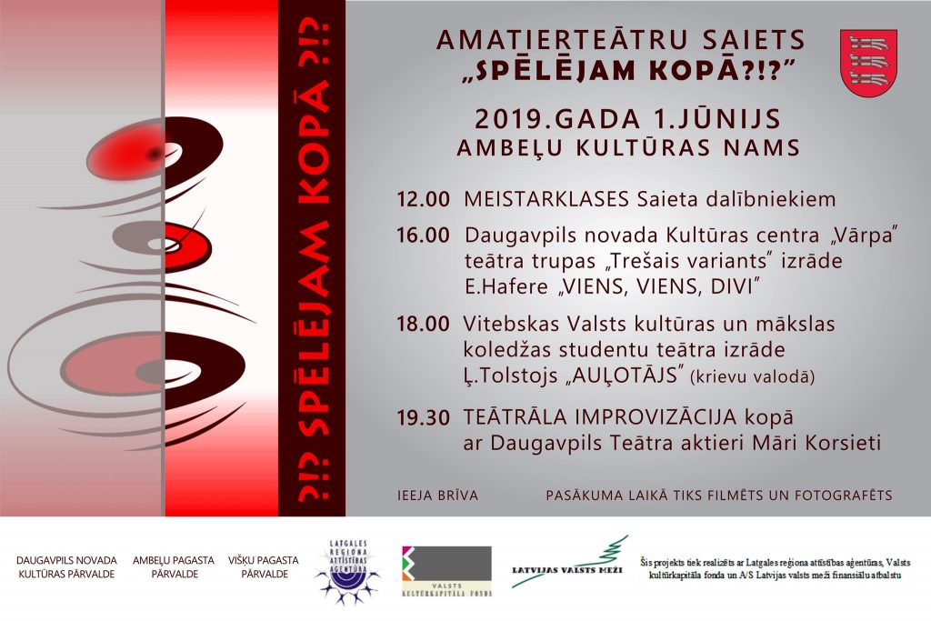 Reizi divos gados Daugavpils novada Kultūras pārvalde rīko amatierteātru saietu „Spēlējam kopā” kādā no deviņpadsmit Daugavpils novada pagastiem. 2019. gada amatierteātru saieta „Spēlējam kopā” lielu saturisko daļu veidos meistarklases, kas padziļinās amatierteātru un teātra interešu kopu dalībnieku un režisoru izpratni par kvalitatīvas izrādes veidošanas paņēmieniem: materiāla atlase, skatuves kustība, aktiermeistarība u.tml.
