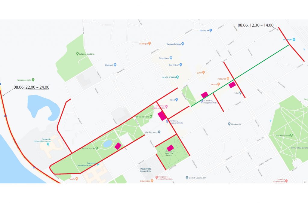 No 6.jūnija no plkst. 18.00 līdz 9.jūnija plkst. 24.00 tiks slēgtas ielas ap Dubrovina parku (ielu tirdzniecība), Vienības laukumu, A.Pumpura skvēru: