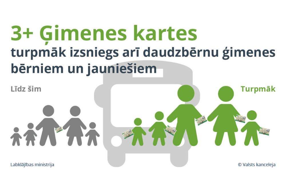 VSIA “Autotransporta direkcija” aicina pašvaldības vērst daudzbērnu ģimeņu uzmanību uz gaidāmajām izmaiņām un mudināt vecākus savlaicīgi vērsties Sabiedrības integrācijas fondā un pasūtīt “3+ Ģimenes karti” saviem bērniem, jo nākamgad skolēni un studenti līdz 24 gadu vecumam, uzrādot vecāku karti, vairs nevarēs saņemt braukšanas maksas atvieglojumus. Bērniem un studentiem būs nepieciešama sava personificēta “3+ Ģimenes karte”. Pieteikties kartei ir iespējams mājaslapā GODAGIMENE.LV vai MOBILĀ LIETOTNĒ “3+ KARTE”. Kartes izgatavošanas laiks ir līdz 45 dienām.