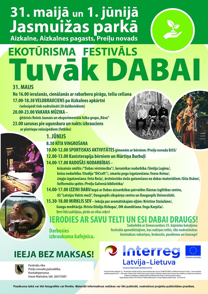 Šī gada 31. maijā un 1. jūnijā Jasmuižas parkā (Aizkalne, Preiļu novads) pirmo reizi norisināsies ekofestivāls „Tuvāk DABAI”, kas aicina ikvienu videi draudzīga dzīvesveida atbalstītāju, ģimenes ar bērniem, jauniešus un seniorus piebiedroties un, radoši darbojoties un iesaistoties daudzveidīgās aktivitātēs, sajusties tuvāk dabai. Festivāla apmeklētāji aicināti ierasties ar teltīm un nakšņot telšu pilsētiņā. Pasākumu rīko Preiļu novada pašvaldība projekta „Ekotūrisma attīstība Latvijā un Lietuvā izmantojot ūdens resursus” ietvaros.