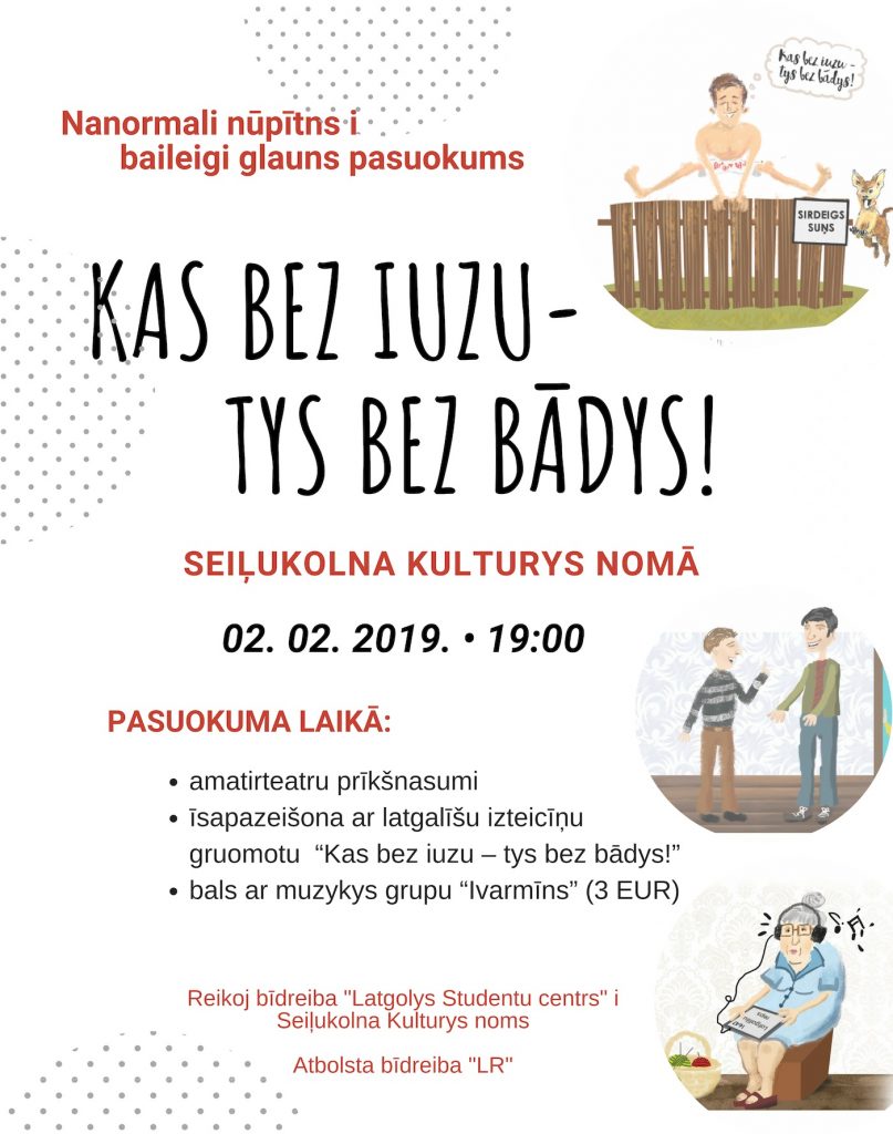 2.febralī Seiļukolna kulturys nomā sevkurs interesents aicynuots apmekleit nanormali nūpītnū i glaunū gruomotys prezentacejis pasuokumu “Kas bez iuzu — tys bez bādys”. Pasuokumā ar smīkleigom miniaturom izastuos dažaidi amatīrteatri nu tyvuokys i tuoluokys apleicīnis. Eipošu puorsteigumu gatavej ari poši LgSC jaunīši. Pasuokuma laikā byus vareiba ari tikt pi gruomotys.