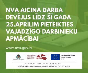Nodarbinātības valsts aģentūra (NVA) turpina pieņemt darba devēju pieteikumus vajadzīgo darbinieku apmācībai Eiropas Sociālā fonda (ESF) projekta “Atbalsts bezdarbnieku izglītībai” pasākumā „Apmācība pie darba devēja”. Tā ir bezdarbnieka praktiskā apmācība, kas ilgst 6 mēnešus: darba devējs pats sagatavo sev vajadzīgo speciālistu, saņemot no NVA dotāciju.