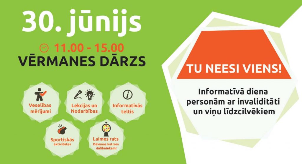 2019.gada 30. jūnijā Rīgā, Vērmanes dārzā norisināsies aktīva diena personām ar īpašām vajadzībām un viņu līdzcilvēkiem “Tu neesi viens!”, kuras ietvaros visi interesenti ir aicināti BEZ MAKSAS piedalīties nodarbībās, izmēģināt spēkus sportiskās aktivitātēs, klausīties izglītojošas lekcijas un konsultēties ar biedrībām un atbalsta organizācijām, kā arī saņemt organizatoru sarūpētas dāvanas.
