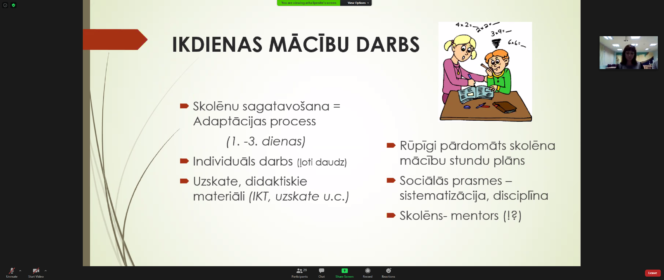 Par atbalsta sniegšanu un mācību procesa nodrošināšanu jauniebraucējiem dalījās pieredzē Arita Līpenīte, Rīgas Pļavnieku pamatskolas direktores vietniece. Ko darīt, ja klasē ir skolēns jauniebraucējs? Skolotājs un dokumentācija, ja klasē ir skolēns jauniebraucējs. Tika apskatīti ikdienas mācību procesa aktuālie jautājumi, lai sekmētu skolēnu jauniebraucēju iekļaušanos mācību procesā.