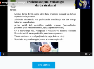 ‘’Darbs un karjera Latvijā’’ ir starptautisks pasākums, kurā piedalās darba devēji no visas Latvijas, tādējādi vakances platformā tiek publicētas latviešu un angļu valodā. Piedaloties Eiropas tiešsaistes darba dienā „Darbs un karjera Latvijā 2020”, gan darba devējiem, gan darba ņēmējiem bija lieliska iespēja atrast vēlamo darba vietu, atrodoties mājās un netērējot laika un finanšu resursus.