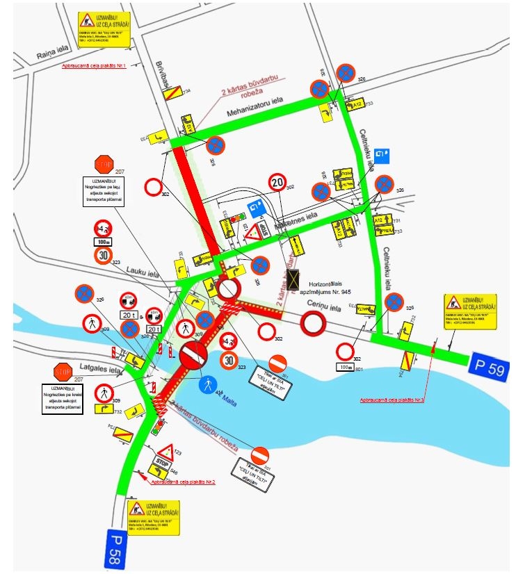 - No 5. līdz 30.maijam ceļa posms tiks slēgts, satiksme tiks novirzīta pa Mehanizatoru ielu, Celtnieku ielu un Nākotnes ielu. (sk. Shēmu nr.1)Visus satiksmes dalībniekus aicinām būt vērīgiem un saprotošiem ceļa remontdarbu laikā.