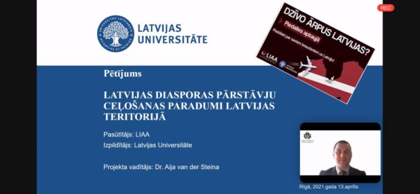 13. aprīlī, Latvijas Investīciju un attīstības aģentūra (LIAA) prezentēja pētījumu “Latvijas diasporas pārstāvju ceļošanas paradumi Latvijas teritorijā”. Pētījumā plašāk apskatīti ārvalstīs dzīvojošo latviešu ceļošanas paradumi un dažādi ar tiem saistītie aspekti. Pēc pētnieku aplēsēm šobrīd ārpus Latvijas dzīvo līdz pat 500 tūkstošiem tautiešu un viņi samērā bieži apmeklē Latviju, tāpēc pētījums kalpos kā vērtīgs izziņas avots tūrisma nozarē strādājošajiem.