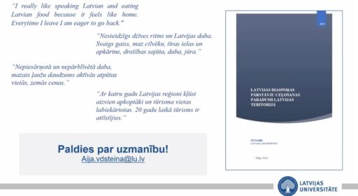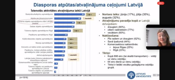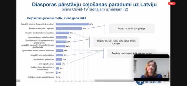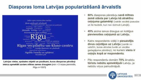 Pētījuma grupas vadītāja A. van der Steina akcentēja, ka šajā pētījumā uzsvars likts uz ārvalstīs dzīvojošo latviešu uzvedības paradumiem: “Mums līdz šim nebija datu par to, kādu iemeslu dēļ diasporas pārstāvji brauc uz Latviju un ko šeit dara. Tagad varam droši apgalvot, ka populārākie iemesli ir radu un draugu apciemošana, kā arī atvaļinājuma pavadīšana. Šādi savu motivāciju doties uz Latviju pamatoja attiecīgi 82 un 65 procenti respondentu. Patīkams pārsteigums bija tas, ka 10 baļļu sistēmā vidējais novērtējums Latvijas apmeklējumam bija 8,5 balles. Tas apliecina, ka diasporas pārstāvji augstu novērtē Latvijas tūrisma nozares piedāvājumu un šeit jūtas labi.”