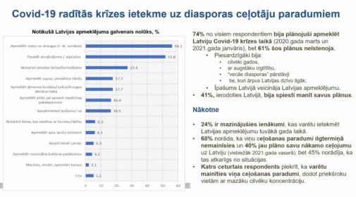 “Līdz šim Latvijā nekad nav pētīti ārvalstīs dzīvojošo latviešu ceļošanas paradumi, tādēļ vēlējāmies noskaidrot, kāda ir faktiskā situācija. Tas mūs interesēja no vairākiem aspektiem gan tūrisma nozares kontekstā, gan uzņēmējdarbības attīstības ziņā. Pēc oficiālās statistikas aptuveni 30% no visiem ārvalstu viesiem, kas ierodas Latvijā, ir diasporas pārstāvji. To netieši apliecina arī šī pētījuma rezultāti – no datiem redzam, ka ārvalstīs dzīvojošie latvieši uz Latviju ceļo vismaz reizi vai divas gadā. Pandēmijas laikā uz Latviju bija ieplānojuši doties 74 procenti aptaujāto respondentu, bet noteikto ierobežojumu dēļ tikai 13 procentiem izdevās to realizēt,” pētījuma prezentācijas atklāšanā uzsvēra LIAA direktors K. Rožkalns, piebilstot, ka pētījums varētu būt labs izziņas avots gan tūrisma pakalpojumu sniedzējiem, gan arī dažādām privātajām medicīnas klīnikām, jo 26% no ārvalstu latviešiem, dodoties uz Latviju, apmeklē arī ārstniecības iestādes.