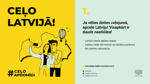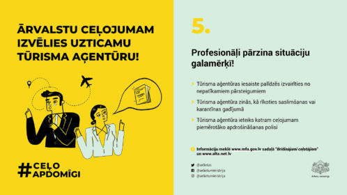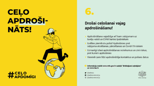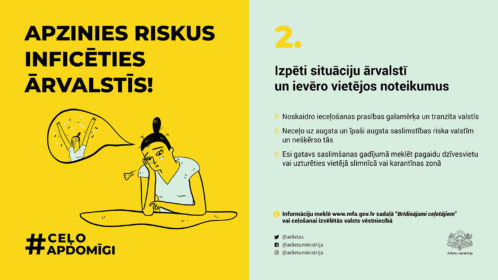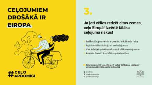 Ārlietu ministrija sadarbībā ar citām iestādēm un organizācijām ir izveidojusi informatīvu kampaņu digitālajā vidē #CeļoApdomīgi, kuras mērķis ir sniegt ieteikumus Latvijas iedzīvotājiem ceļošanai šovasar, kurā ietverti astoņi galvenie ieteikumi.