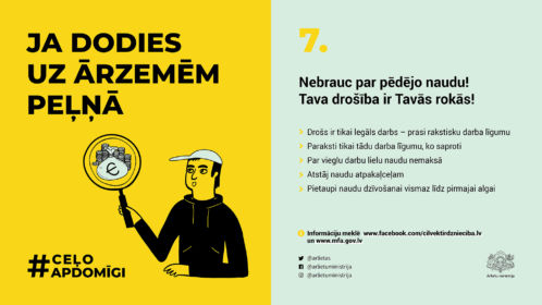 Vasarā daudzi dodas peļņā uz ārvalstīm. Drošs ir tikai legāls darbs, un darba samaksai jāatbilst padarītajam darbam. Darba meklētāji tiek aicināti pieprasīt rakstisku darba līgumu saprotamā valodā un neticēt kārdinošiem solījumiem. Nebrauc peļņā par pēdējo naudu!