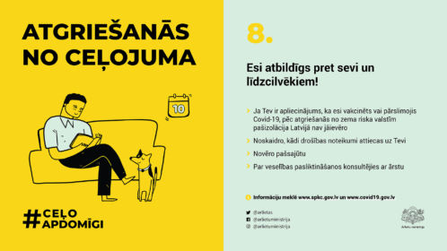 Atgriežoties Latvijā, jāievēro drošības noteikumi, ja tādi ir noteikti. Drošības pasākumi nav neērtība, bet gan atbildīga attieksme pret sevi un līdzcilvēkiem, lai visi varam baudīt ceļojumus arī turpmāk.
