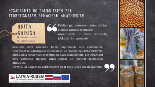 Savukārt, apmācību dalībniece no Rēzeknes Anita Kairiša, kam sirdslieta ir mandalas, atzīmēja, ka seminārs deva iedvesmu būvēt atgriešanās ceļu amatniecībā, izmantojot mūsdienīgākus risinājumus, paužot milzīgu pateicību lektorēm, kuras spēja runāt nevis tikai teorētiski, bet izmantojot savu personīgo pieredzi, gūtās atziņas un iesaistot dalībniekus diskusijās.