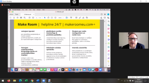 Biedrības “Patvērums “Drošā māja”” Dialoga platforma sadarbībā ar biedrību “Make Room” 2021.gada 27.maijā ZOOM platformā organizēja tikšanos par jauniebraucēju – ārvalstu studentu, patvēruma meklētāju, cilvēku ar bēgļa vai alternatīvo statusu – sabiedrisko līdzdalību un aktīvāku iesaisti sev nozīmīgu problēmu risināšanā, lai kopā ar NVO sektoru, sociālajiem uzņēmējiem, valsts un pašvaldības iestādēm pārrunātu jautājumus par iebraucēju līdzdalību.