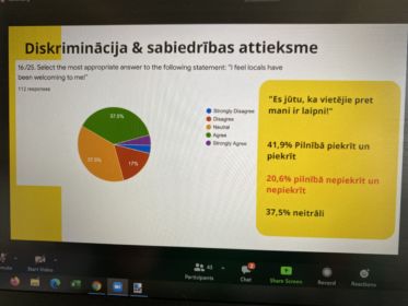 Tikšanās turpinājumā biedrības “Make Room” direktors Miks Celmiņš iepazīstināja ar šobrīd īstenoto projektu “Make Room for an Inclusive Society (Veido vietu iekļaujošai sabiedrībai)”, kas tiek līdzfinansēts Rīgas domes izglītības, kultūras un sporta departamenta Sabiedrības integrācijas programmas ietvaros – veiktās aptaujas rezultātiem un četru fokusdiskusiju apkopojumu, akcentējot galvenās problēmas. Tāpat “Make Room” aicināja valsts un pašvaldības iestādes, nevalstiskās organizācijas un sociālos uzņēmumus, kuri ikdienā strādā ar jauniebraucējiem un aktuālu problēmu risināšanu savā darbā iesaistīties diskusijā, kā arī aicināja apzināt Latvijas organizācijas un iestādes, kas būtu ieinteresēti veicināt pašu jauniebraucēju aktīvu iesaistīšanos integrācijas veicināšanā un pārmaiņu radīšanā.