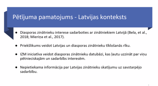 Pētījuma mērķis bija identificēt, kādi faktori nosaka Latvijas un diasporas zinātnieku sadarbību un kādi politikas risinājumi var šo sadarbību sekmēt. Šāds pētījuma mērķis tika izvirzīts, jo pētnieki, kas dzīvo vai strādā ārpus Latvijas, var sniegt vērtīgu pienesumu gan Latvijas zinātnes, gan arī tautsaimniecības attīstībai.