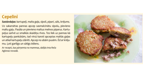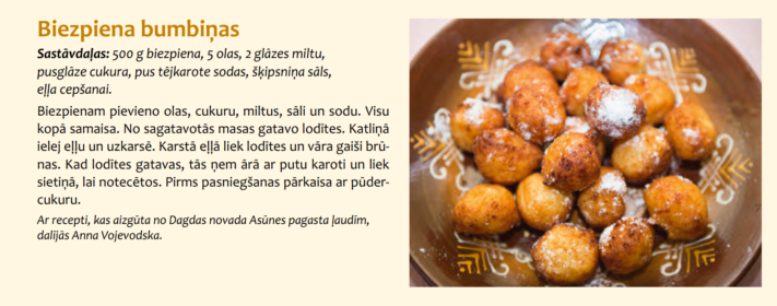 Receptes remigrācijas “krustmāte” aizguva no “Latgales pavārgrāmatas”, ko Krāslavas novada dome sadarbībā ar biedrību “Latgales kulinārā mantojuma centrs” ir izdevusi. Tajā ir apkopotas Latgales reģiona un Krāslavas novada tradicionālo ēdienu un dzērienu receptes. Pavārgrāmata tika izdota ar mērķi popularizēt Latgales reģiona un Krāslavas novada kultūras tradīciju un kulinārā mantojuma saglabāšanu, kā arī popularizēt reģionu kā gastronomiskā tūrisma galamērķi. Pavārgrāmatā ievietotas vairāk nekā 200 dažādu recepšu, kas tiek gatavotas arī šodien maltītēs, un arī tādas receptes, kuras daudziem Latgalē būs arī kaut kas jauns.