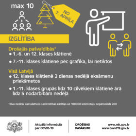 Pašvaldībās, kurās jaunu Covid-19 inficēto skaits uz 100000 iedzīvotāju divās nedēļās pārsniedz 200, 12. klasēm varēs organizēt mācības klātienē ne vairāk kā divas dienas nedēļā priekšmetos, kuros tiek kārtoti centralizētie eksāmeni. Citu klašu skolēniem šajās pašvaldībās var organizēt līdz 5 klātienes nodarbībām nedēļā ārpus telpām un nepārsniedzot 10 cilvēku skaitu grupā.