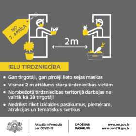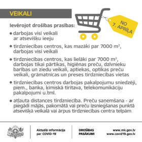 Toties no 7. aprīļa neatkarīgi no preču sortimenta un tirdzniecības platības durvis pircējiem varēs vērt visi veikali, kuriem ir atsevišķa ieeja un kuri neatrodas tirdzniecības centrā, kura tirdzniecības platība ir lielāka par 7000 kvadrātmetriem. Mazākos tirdzniecības centros varēs strādāt visas tirdzniecības vietas. Protams, gan tirgotājiem, gan pircējiem jāievēro drošības prasības.