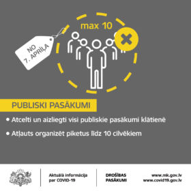 Arī pēc Lieldienām gan privāti, gan publiski pasākumi būs aizliegti. Tomēr no 7. aprīļa klātienē drīkstēs organizēt gājienus un piketus ārpus telpām līdz 10 personām, ievērojot epidemioloģiskās drošības pasākumus. Savukārt privāti ārpus telpām drīkstēs tikties divas mājsaimniecības (līdz 10 cilvēkiem). Spēkā saglabāsies līdzšinējā norma, ka bērēs un neatliekamu kristību ceremonijā atļauts pulcēties līdz desmit cilvēkiem no divām mājsaimniecībām, ievērojot distanci no apkārtējiem un lietojot mutes un deguna aizsegu.