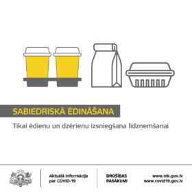 Ministru kabinets apstiprināja drošības prasības, kādas sabiedriskās ēdināšanas jomā būs jāievēro gan ēdinātājiem, gan apmeklētājiem tad, kad epidemioloģiskā situācija valstī būs pietiekami droša, lai varētu klātienē sākt darboties ēdināšanas vietu āra teritorijas. Taču līdz tam sabiedriskās ēdināšanas vietas turpina darbu, izsniedzot ēdienu un dzērienus līdzi ņemšanai.