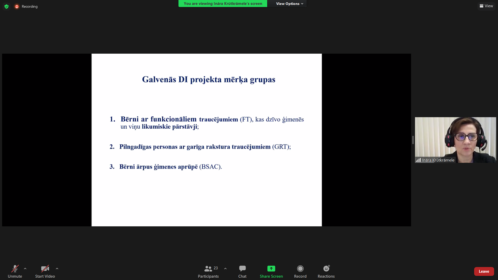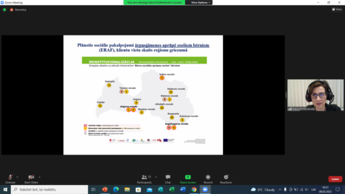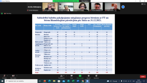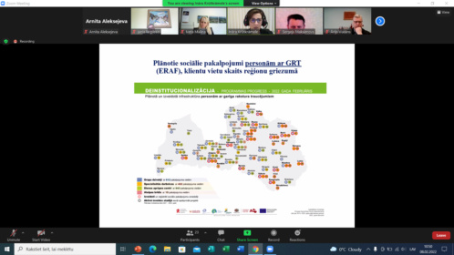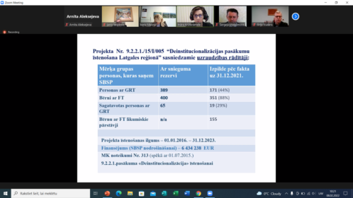 Ar plašu informāciju par pakalpojumu nodrošināšanu projekta “Deinstitucionalizācijas pasākumu īstenošana Latgales reģionā” (DI) ietvaros ziņoja projekta vadītāja Ināra Krūtkrāmele. Neskatoties uz pandēmijas izraisītajām grūtībām, DI projekta realizācija Latgales reģionā turpinājās, stabili pieaugot sniegto pakalpojumu skaitam. 2021.gada nogalē sabiedrībā balstītos sociālos pakalpojumus bija saņēmušas 677 unikālās personas, no kurām 171 cilvēks bija personas ar garīga rakstura traucējumiem, 155 personas, kas ir bērnu ar funkcionāliem traucējumiem likumiskie pārstāvji un skaitliski vislielākais īpatsvars – 351, ir bērni ar funkcionāliem traucējumiem. Tāpat sēdes klātesošie tika iepazīstināti ar Eiropas reģionālās attīstības fonda (ERAF) ieguldījumiem Latgales reģionā, kur ar fonda atbalstu tiek veidota arī sociālo pakalpojumu infrastruktūra DI plāna realizēšanai. Līdz 2021. gada decembrim personām ar GRT Latgalē jau ir izveidotas un darbojas 163 vietas Dienas aprūpes centros (DAC), 93 vietas specializēto darbnīcu pakalpojumu sniegšanai, ka arī 58 vietas grupu dzīvokļu pakalpojuma realizēšanai. Plašāk par DI projektā paveikto var iepazīties šeit.