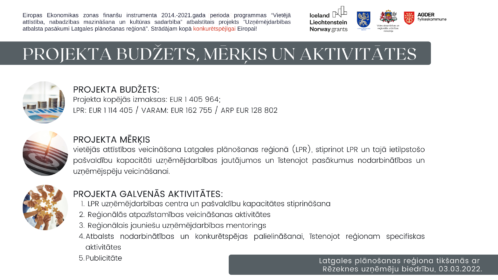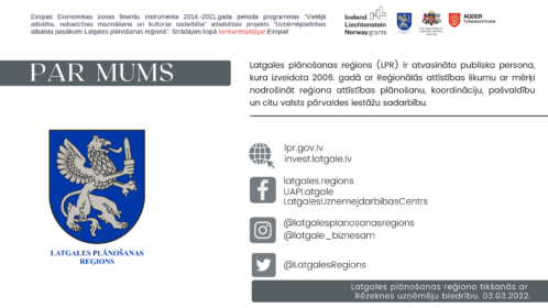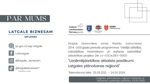 Eiropas Ekonomikas zonas finanšu instrumenta 2014.-2021.gada perioda programmas “Vietējā attīstība, nabadzības mazināšana un kultūras sadarbība” atbalstītais projekts ”Uzņēmējdarbības atbalsta pasākumi Latgales plānošanas reģionā” ietvaros. Strādājam kopā konkurētspējīgai Eiropai!