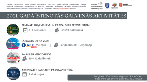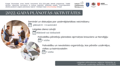 2022.gada 3.martā, projekta Latgale biznesam/UAP Latgale vadītāja Sarmīte Teivāne piedalījās RĒZEKNES UZŅĒMĒJU BIEDRĪBAS organizētajā seminārā, kur kopā ar Latgales plānošanas reģions kolēģiem – Latgales uzņēmējdarbības centra vadītāju Andri Kucinu un Latgales speciālās ekonomiskās zonas pārvaldnieka vietnieku Vladislavu Stankeviču- informēja par tuvākajiem uzņēmējdarbības atbalsta pasākumiem Latgales plānošanas reģionā.