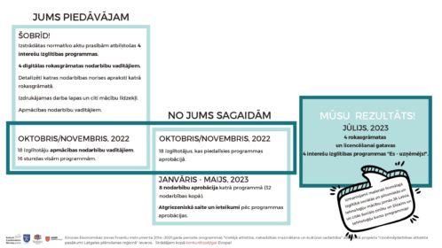 Pirmā apmācību ievadnodarbība ir paredzēta 17.oktobrī Daugavpilī un Rēzeknē (pēc izvēles). Laiks un ilgums tiks precizēts.