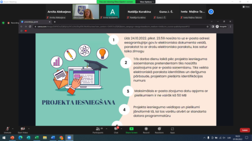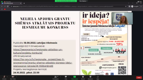 2022.gada 7.septembrī tiešsaistes platformā ZOOM notika informatīvais seminārs, kurā Latgales plānošanas reģiona Latgales uzņēmējdarbības centrs (LPR LUC) iepazīstināja ar EEZ FI 2014. – 2021.gada perioda programmas “Vietējā attīstība, nabadzības mazināšana un kultūras sadarbībā” neliela apjoma grantu shēmas atklātā projektu iesniegumu konkursa “Atbalsts biznesa ideju īstenošanai Latgalē” 3. kārtas (noslēdzošās) nosacījumiem.