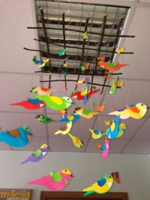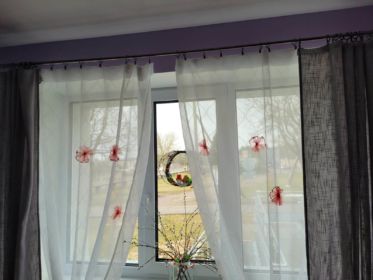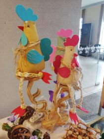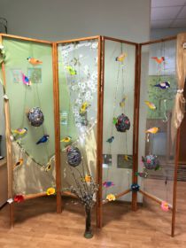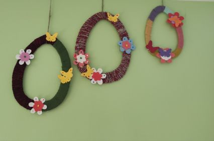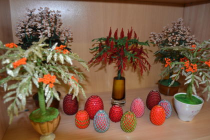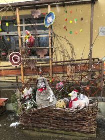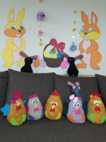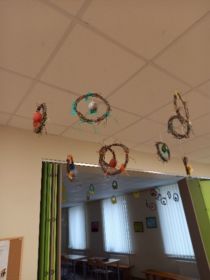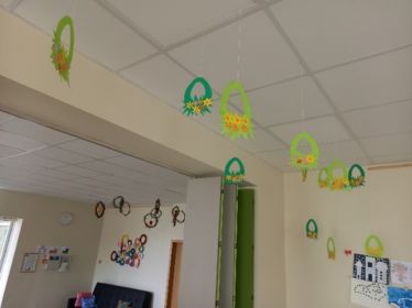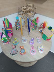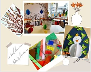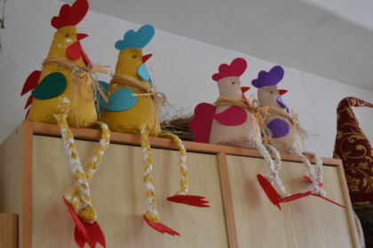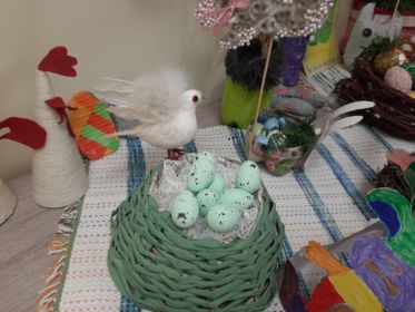 Visu nodarbību vadītāji aktīvi darbojušies, izgatavojuši dažādas dekorācijas, kuras nu rotā gan DACu, gan arī Preiļu novada Labklājības pārvaldes ēku. Esam “sacepuši” porcelāna oliņas, zaķus, taureņus, kas glīti sakarināti priedes zarā, skandina telpu, paejot garām katram gājējam. Dabas materiāli vienmēr atrod lielisku pielietojumu – tapušas žagaru apļveida pamatnes, uz kurām glīti iekārtojušies dzijas cālēni sūnās. Papjē mašē pus olas, gatavotas no kartona olu kastītēm, savos klēpjos aijā kādu putnēnu. Logos virpuļo zaru, krāsainu spalvu Lieldienu vēstneši-košās olas. Šūšanas nodarbībās darinātie cālēni, lepni slej savas grebenes pret pašdarinātiem pūpoliem no ķirbju sēklām un zariem.