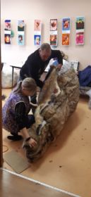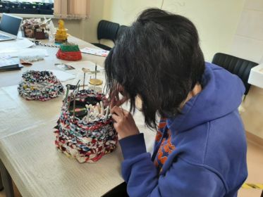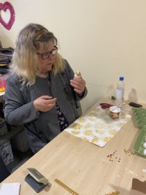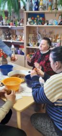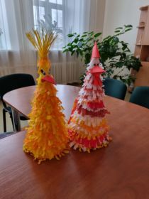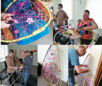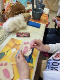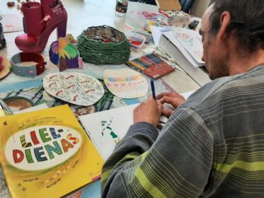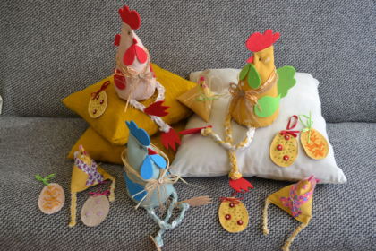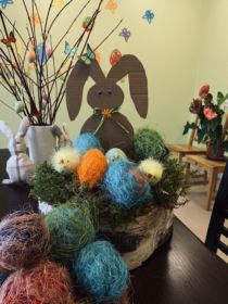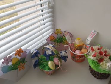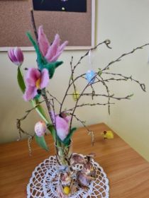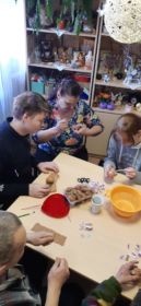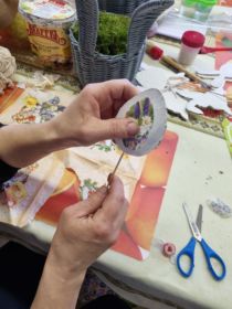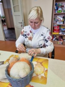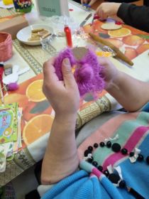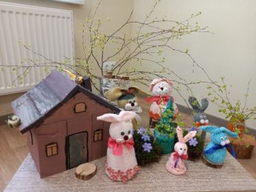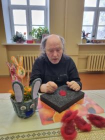 Daži jau piekārtoja savas mājas, pagalmus, nosvētīja pūpolus. Bet Dienas centrā ka lielā darbnīcā top Lieldienu dekori un dāvaniņas. Šoreiz sakām apgūt filcēšanas tehniku no vilnas, veidojot gan cālīšus, gan krāsainus putnus, ziedus un pat krelles, apguva arī groziņu pīšanu no papīra strēmelēm, piepildot tās ar krāsainām olām un zaķiem. Ar prieku izveidoja no papīra glaunus vistiņu un gailīti ar pilnu ligzdiņu. Pie tam tika konstatēts, ka daudziem apmeklētajiem ir labas prasmes un talanti šajās nodarbēs. Domājam, ka kāds šīs prasmes pielietos arī vēlāk savā ikdienas dzīvē.