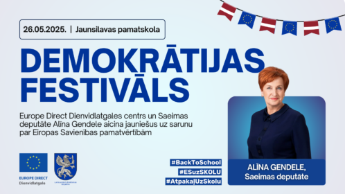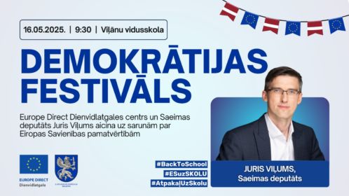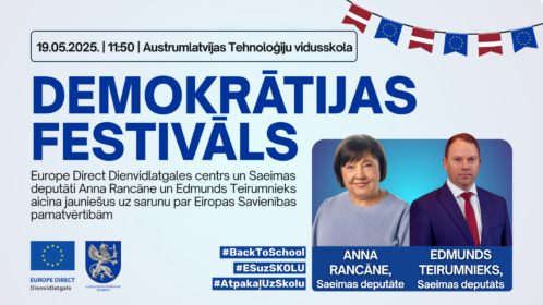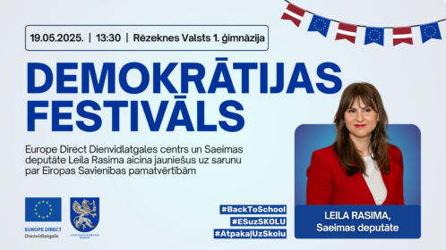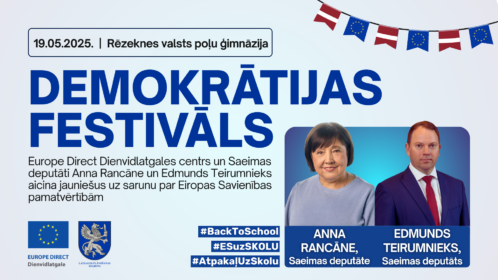 Viens no Eiropas Savienības mērķiem ir zinošas, kritiski domājošas, demokrātiskās vērtībās balstītas sabiedrības stiprināšana. Šo mērķi mēs varam sasniegt tikai kopā, daloties savās zināšanās, pieredzē, mācoties vienam no otra, tāpēc, Europe Direct Dienvidlatgales centrs* sadarbībā ar Saeimas Cilvēktiesību un sabiedrisko lietu komisijas Latgales apakškomisiju, Eiropas Komisijas akcijas „Atpakaļ uz skolu/ Atpakaļ uz universitāti 2025” ietvaros, 2025. gada 16., 19. un 26. maijā Rēzeknes valstspilsētas un Līvānu un Rēzeknes novadu mācību iestādēs rīko “Demokrātijas festivālu”.