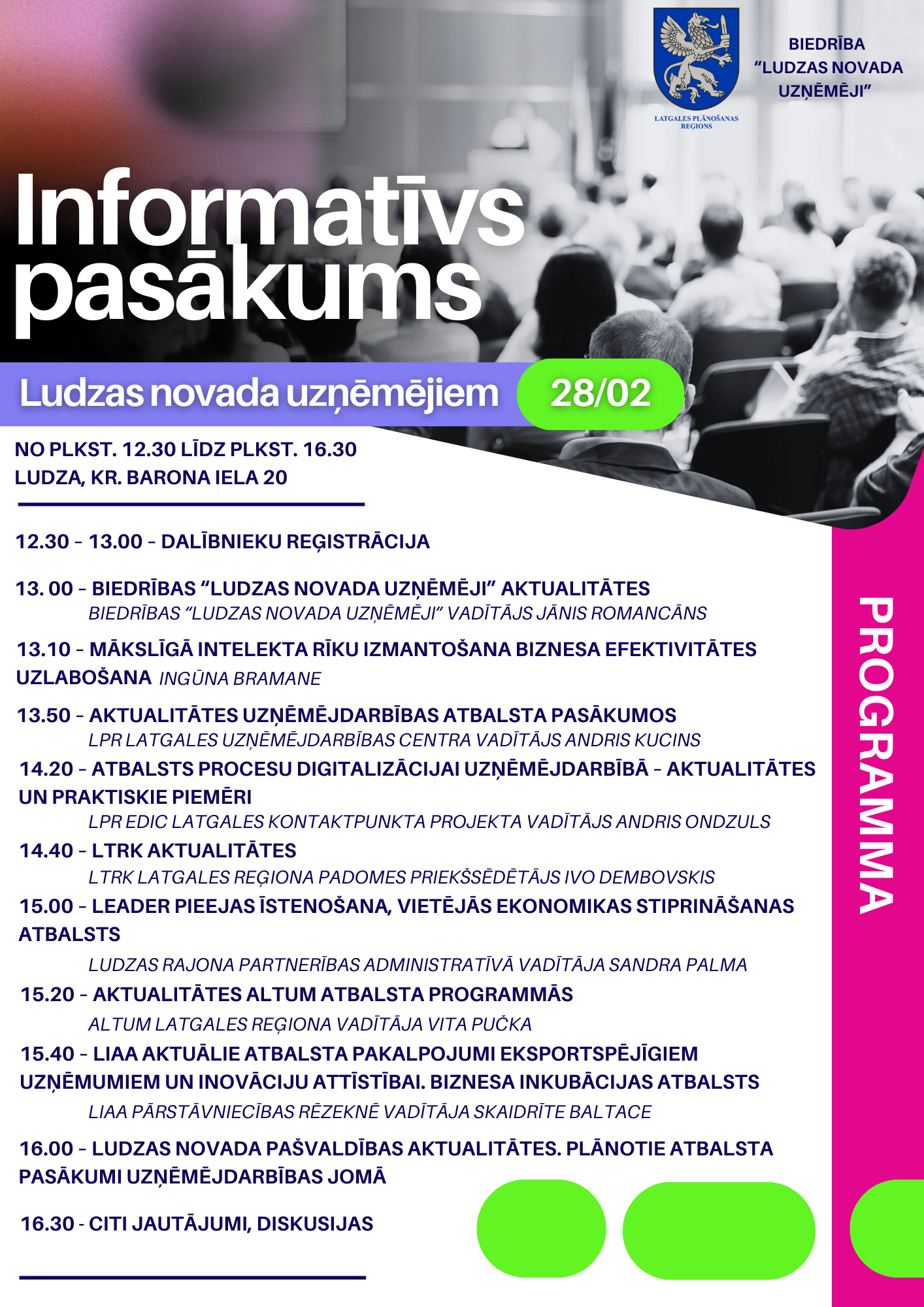Latgales plānošanas reģiona (LPR) Latgales uzņēmējdarbības centrs (LUC) sadarbībā ar biedrību “Ludzas novada uzņēmēji” 28. februārī aicina uz informatīvu pasākumu, kas norisināsies Ludzā, Kr. Barona ielā 20. No plkst. 12.30 līdz 16.30 vietējie uzņēmēji, eksperti un attīstības organizāciju pārstāvji runās par aktuālākajiem jautājumiem saistībā ar uzņēmējdarbības attīstību, digitālo risinājumu izmantošanu, pieejamajiem atbalsta mehānismiem un citiem būtiskiem aspektiem.