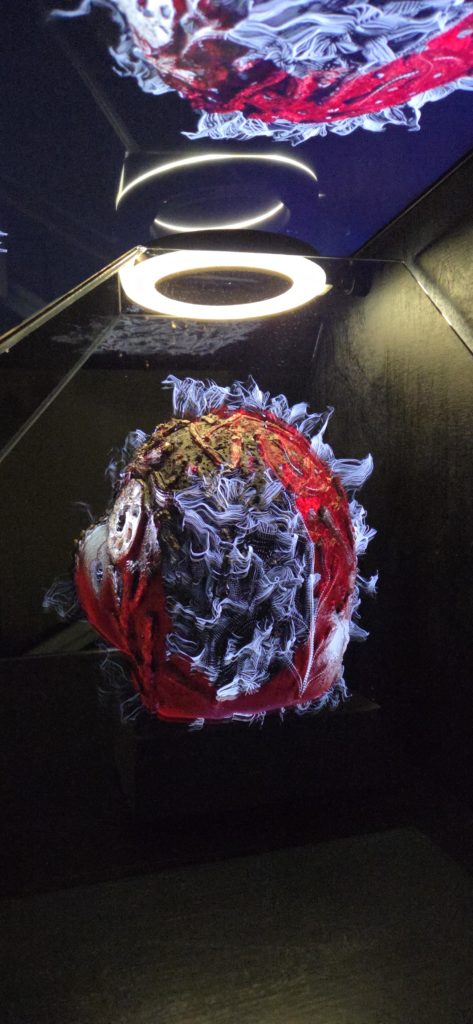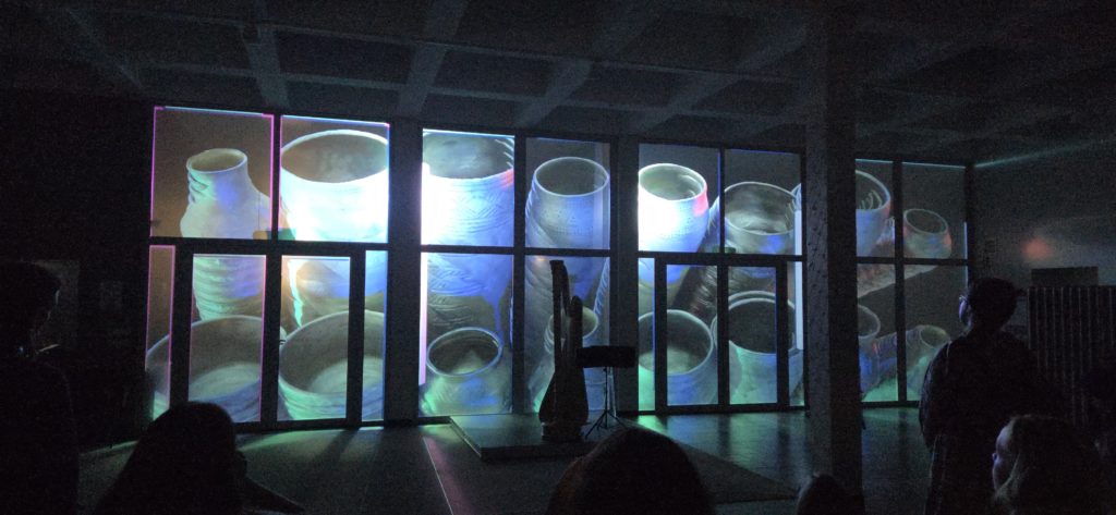 Izstādes centrā ir 3D video instalācija, ko radījis pazīstamais lietuviešu videomākslinieks Rimas Sakalausks. Viņa darbs tapis, iedvesmojoties no keramiķu Kristinas Motuzienes un Ramunes Pranckevičiutes radītajiem mākslas darbiem. Liela izmēra projekcijā skatītāji var vērot, kā keramika transformējas digitālā vidē – kustīgās līnijās, gaismās, faktūrās un ritmos. Šī audiovizuālā pieredze rada sajūtu, it kā māls un skaņa saplūstu vienotā “meta-keramikas” pasaulē.