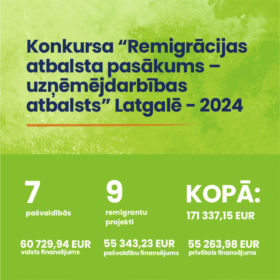 2024. gadā septiņās Latgales pašvaldībās tika organizēti “Remigrācijas atbalsta pasākumi – uzņēmējdarbības atbalsts” konkursi, kā rezultātā tika sasniegts augstākais rezultatīvais rādītājs starp Latvijas reģioniem. Kopā tika īstenoti 9 remigrantu projekti, apgūstot 60 729,94 EUR valsts finansējuma, savukārt, konkursu gaitā tika piesaistīts arī pašvaldību finansējums 55 343,23 EUR apmērā, kā arī privātais finansējums 55 263,98 EUR apmērā.