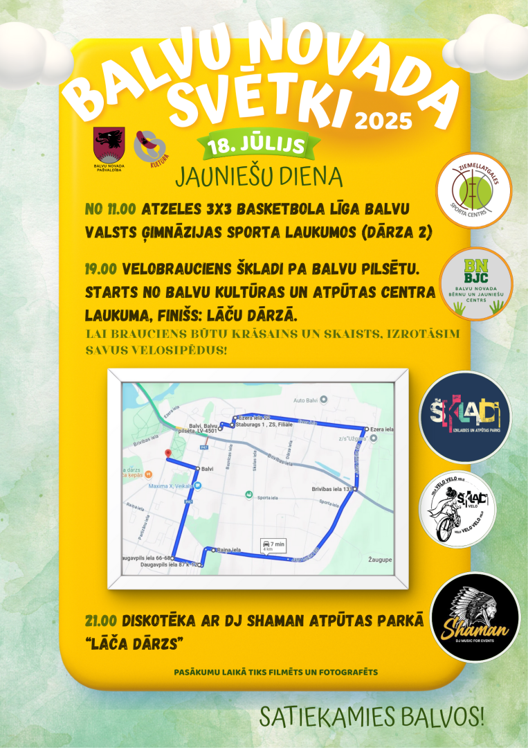 - Plkst. 19.00 no Balvu Kultūras un atpūtas centra laukuma iespēja doties kopīgā velobraucienā ”Šķladi Velo Party” – ar velosipēdiem un mūzikas ritmiem ierībināsim Balvu pilsētas ielas.