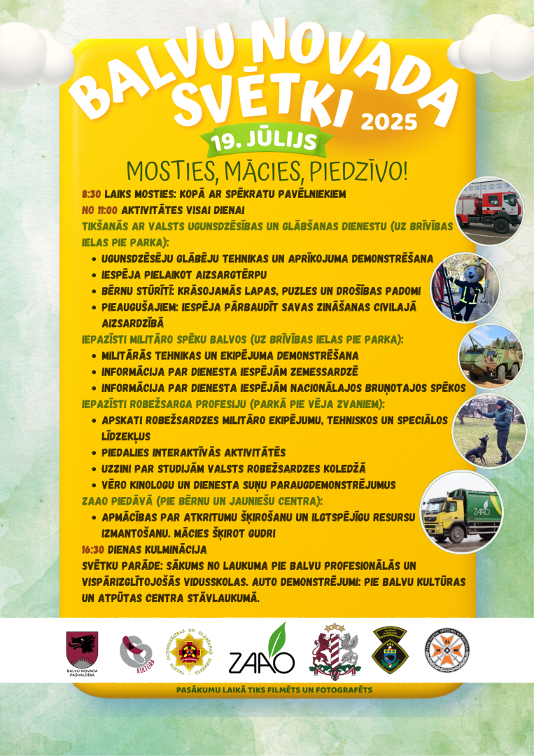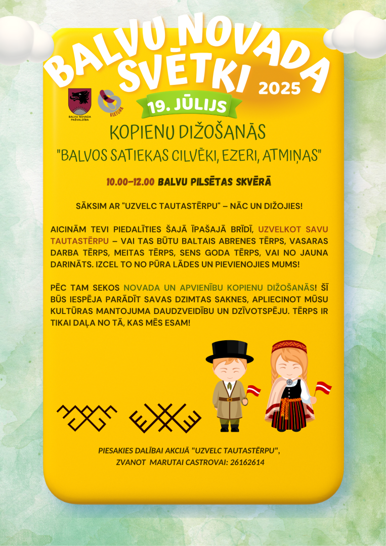 No 18. līdz 19. jūlijam Balvu novada iedzīvotāji un viesi laipni aicināti apmeklēt Balvu novada svētku pasākumus – diena būs piepildīta ar krāsainiem notikumiem, radošām aktivitātēm, sirsnīgiem koncertiem un svētku lielkoncertu ”Ai, Latgale, Tu dvēselīte mana”.