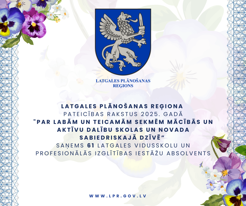 Izlaidumu laiks visā Latvijā ir klāt, un arī šogad Latgales plānošanas reģions turpina tradīciju godināt jauniešus, kuri apliecinājuši sevi gan mācībās, gan aktīvā līdzdalībā sabiedriskajos procesos. Sadarbībā ar Latgales pašvaldībām, Pateicības rakstus saņems 61 absolvents no vispārējās vidējās un profesionālās izglītības iestādēm, kurš ar savu neatlaidību, atbildību un sabiedrisko aktivitāti ir pelnījis īpašu atzinību.