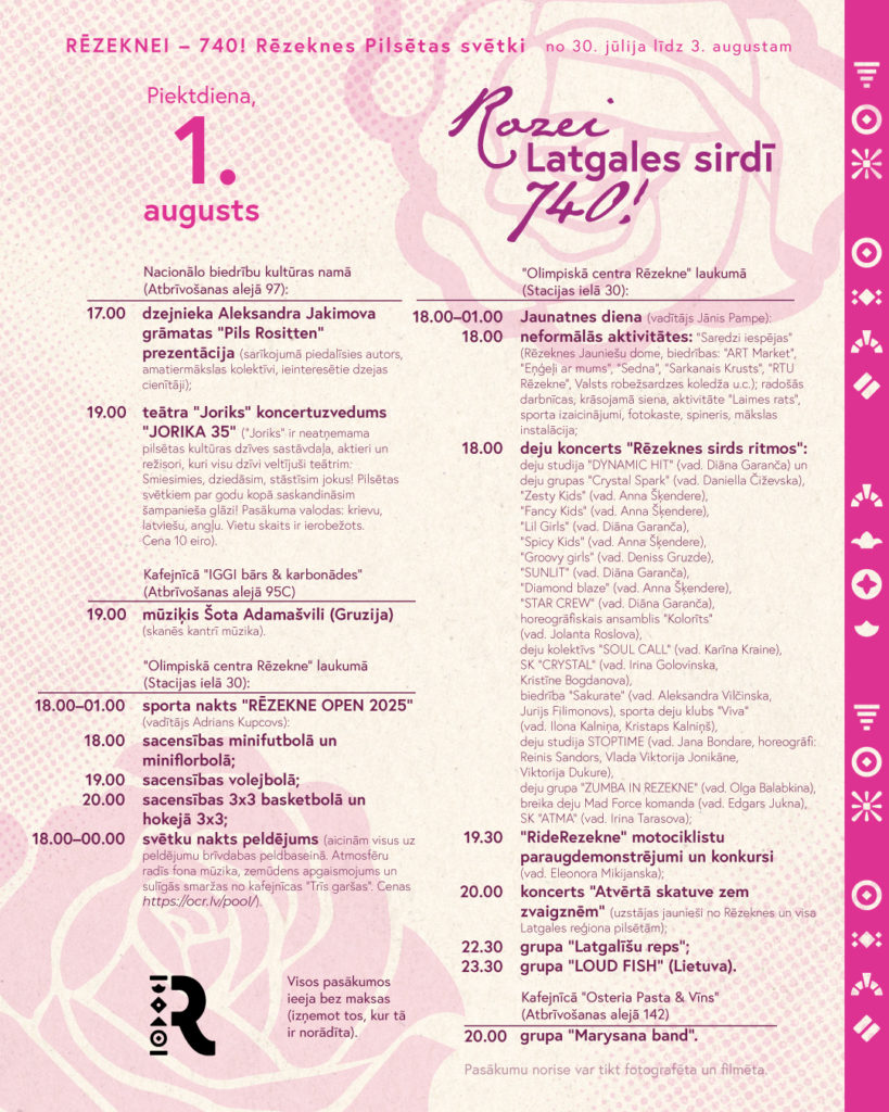 Piektdiena, 1. augusts, būs veltīta teātrim, sportam un jaunatnei. Teātris “Joriks” plkst. 19.00 ielūdz uz koncertuzvedumu “Jorika 35” (biļešu cena 10 eiro). Tāpat plkst. 19.00 Rēzeknes olimpiskā centra laukumā sāksies grandioza Jaunatnes diena ar neformālām aktivitātēm “Saredzi iespējas” un radošajām darbnīcām. Par mūsu talantīgajiem jauniešiem varēs priecāties deju koncertā “Rēzeknes sirds ritmos” un koncertā “Atvērtā skatuve zem zvaigznēm”. Jauniešiem noteikti patiks “RideRezekne” motociklistu paraugdemonstrējumi, kā arī grupu “Latgalīšu reps” un “Loud Fish” (Lietuva) uzstāšanās. No plkst. 18.00 līdz 01.00 notiks arī tradicionālā sporta nakts “Rēzekne Open 2025” (sacensības minifutbolā un miniflorbolā, volejbolā, 3×3 basketbolā un hokejā 3×3, piesakies).