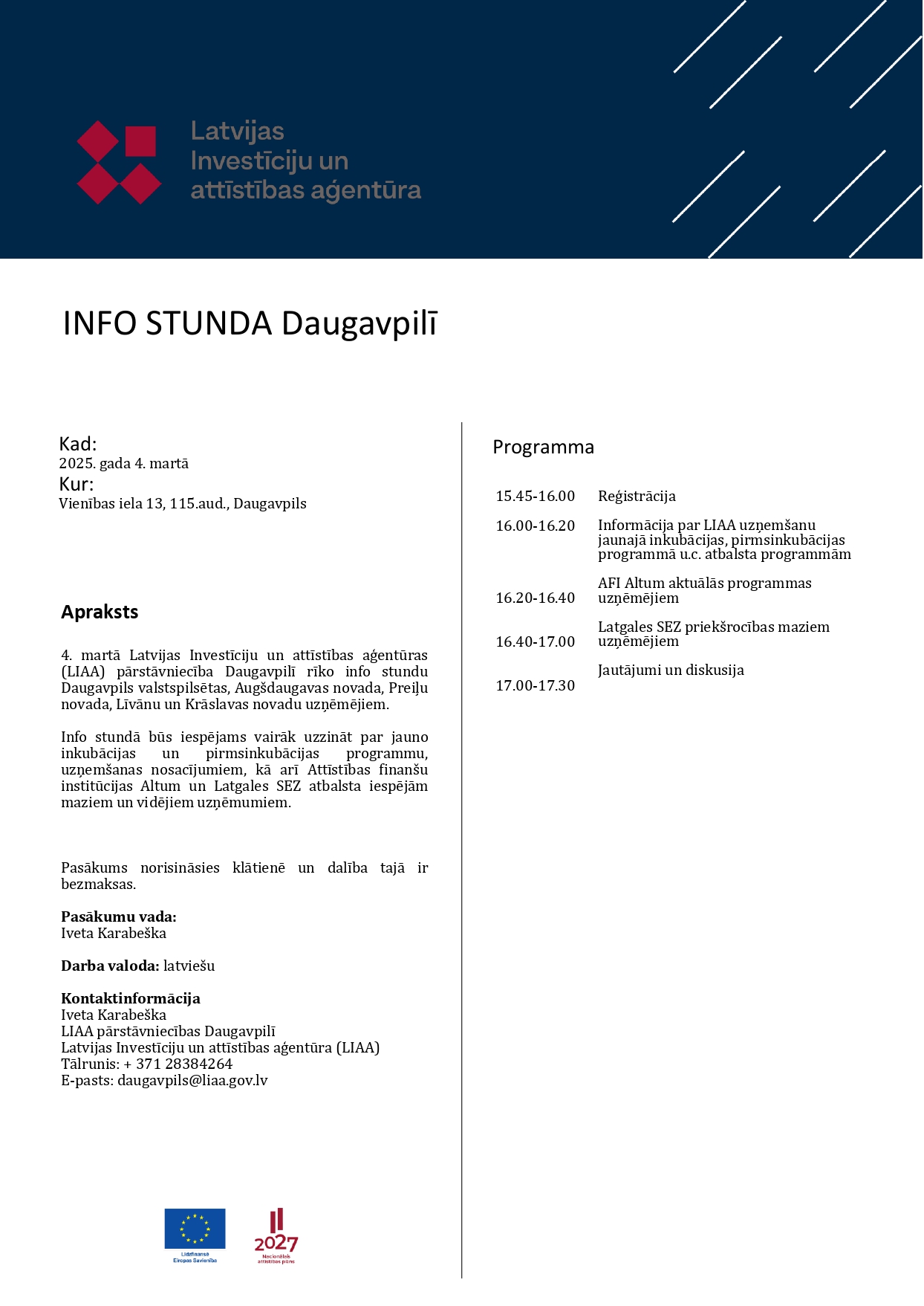 2025. gada 4. martā Latvijas Investīciju un attīstības aģentūras (LIAA) pārstāvniecība Daugavpilī rīkoja INFO STUNDU Daugavpils valstspilsētas, Augšdaugavas novada, Preiļu novada, Līvānu un Krāslavas novadu uzņēmējiem.