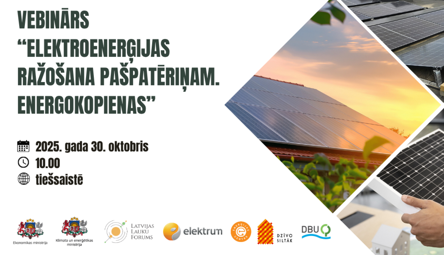 Ekonomikas ministrija, Klimata un enerģētikas ministrija, Latvijas Lauku forums un Elektrum Enerģijas centrs 2025. gada 30. oktobrī aicina piedalīties informatīvā vebinārā “Elektroenerģijas ražošana pašpatēriņam. Daudzdzīvokļu namiem (energokopienām)”.