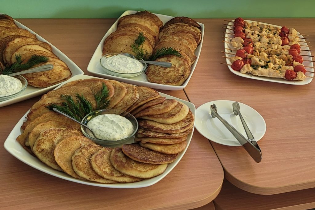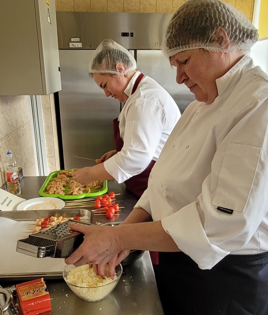 Pēc teorētiskās daļas sekoja praktiskais darbs. Pavāri komandās gatavoja dažādus ēdienus: frikadeļu zupu ar kausēto sieru, svaigu kāpostu salātus, pamatēdienu – kartupeļu biezeni ar vistas un ķirštomātu šašliku un mērci, launaga ēdienu – kartupeļu pankūkas ar krējuma mērci, kā arī desertu – pannakotu. Darbnīcas laikā valdīja radoša un draudzīga atmosfēra, kurā dalībnieki dalījās savās zināšanās, gatavošanas pieredzē un idejās par to, kā padarīt skolu ēdienkarti vēl pievilcīgāku skolēniem.