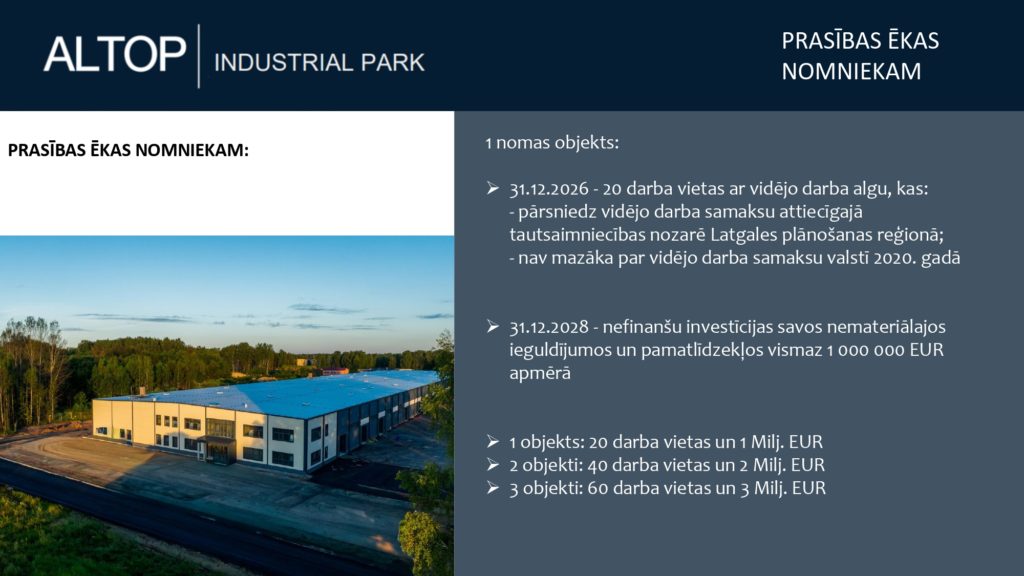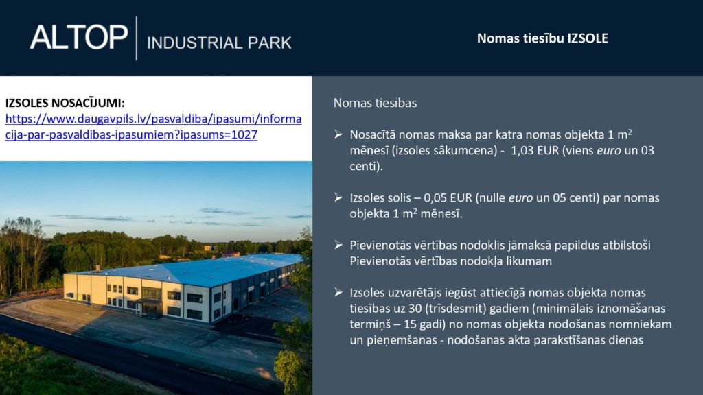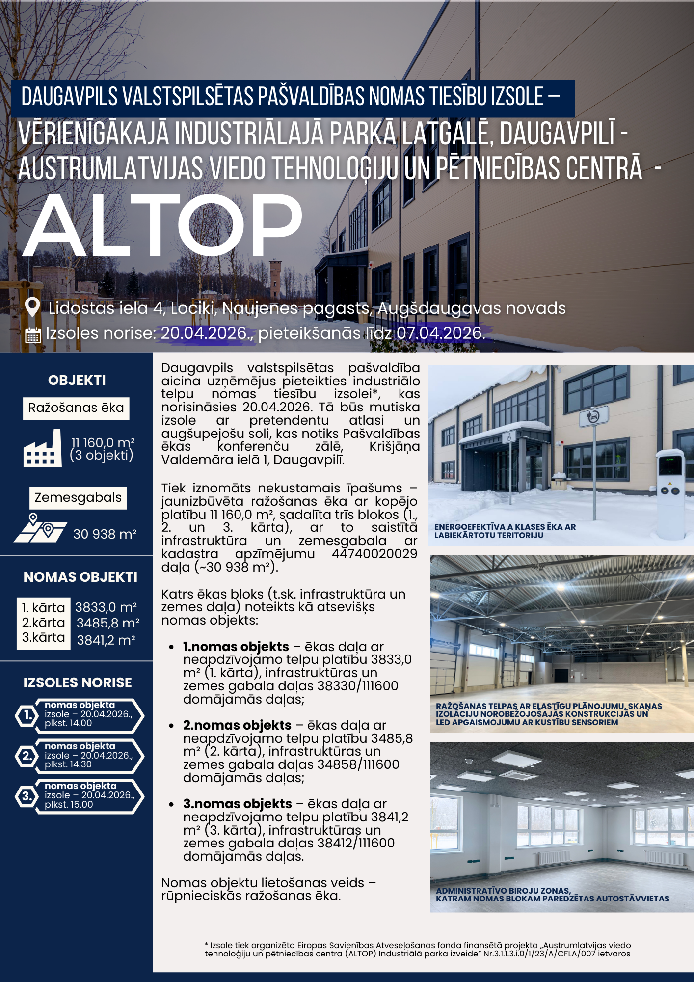 Jāatzīmē, ka Daugavpils valstspilsētas pašvaldības domes sēdē šī gada februārī tika apstiprināti precizētie ALTOP industriālā parka ražošanas telpu nomas izsoles noteikumi, kas paredz labvēlīgākus nosacījumus potenciālajiem investoriem, samazinot prasības par uzņēmējdarbības rādītāju sasniegšanu.