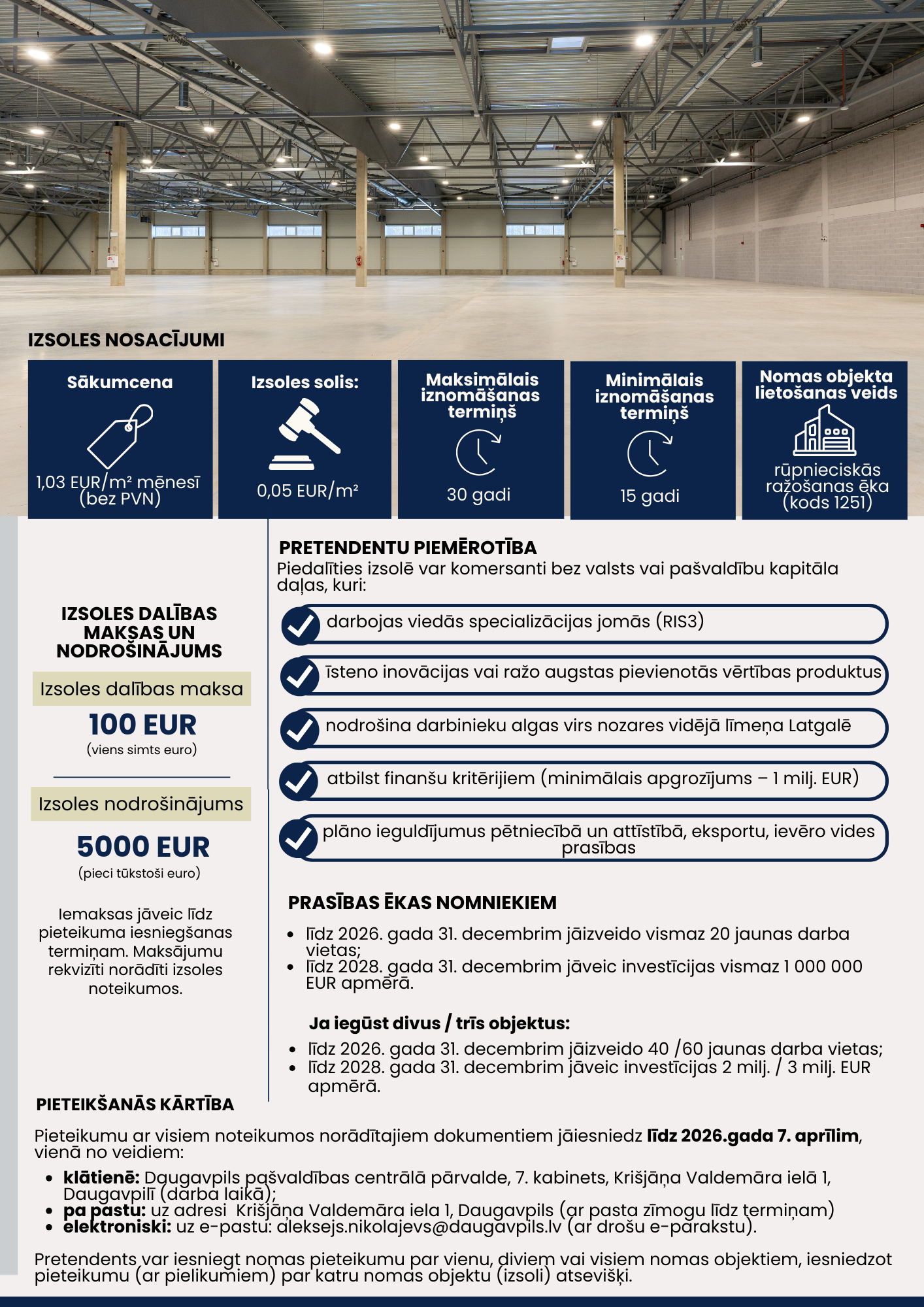 Šobrīd Daugavpils valstspilsētas pašvaldība aicina uzņēmējus pieteikties industriālo telpu nomas tiesību izsolei, kas norisināsies šī gada 20. aprīlī. Pieteikumu dalībai izsolē var iesniegt līdz 2026. gada 7. aprīlim.